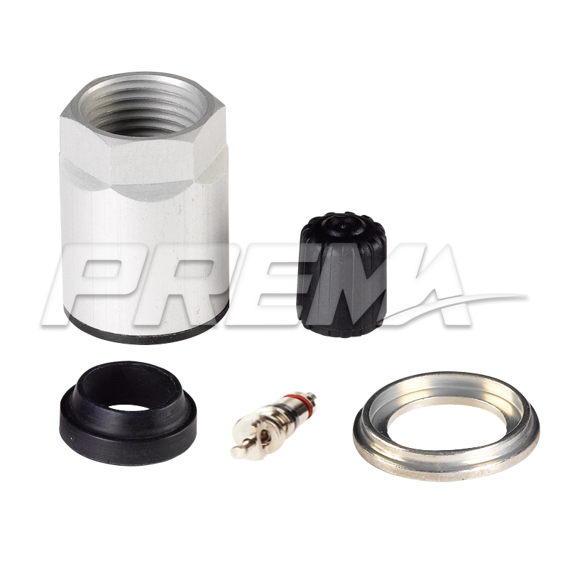 A box of 10 service kits, with each including: 1 nut, 1 rubber grommet, 1 plastic washer, 1 valve cap and 1 valve core.